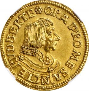 This example was offered again as lot 40032 in Stack's Bowers 2021 ANA sale, where it sold for $78,000. The archbishop struck a series of gold coins in 1513 (Fr-572 thru -578) ranging from 2 ducats to 6 ducats, in round and klippe (square) format. For the five ducats, Fr-576a is the square and Fr-576b is the round.