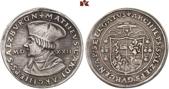 "Matthäus Lang von Wellenburg, 1519-1540. 1/3 Guldiner 1522. 8.81 g. Stempel von Ulrich Ursenthaler d. Ä. Probszt 225; Zöttl 227 (Type 4). Von großer Seltenheit. Henkelspur, Felder überarbeitet, sehr schön. (archbishopric of Salzburg, Matthäus Lang of Wellenburg, 1519-40, one-third guldiner of 1522, dies by Ulrich Ursenthaler. Extremely rare, mount mark, fields tooled, very fine.)"