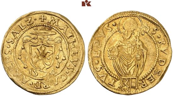 "Matthäus Lang von Wellenburg, 1519-1540. Dukat 1524. GOLD. R Winz. Prägeschwäche, sehr schön-vorzüglich. Exemplar der Auktion Bankhaus Partin 29, München 1989, Nr. 712. (archbishopric of Salzburg, Matthäus Lang of Wellenburg, 1519-40, ducat of 1524. Rare, weakly struck, very fine to extremely fine.)"