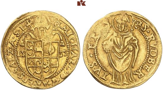 "Michael von Küenburg, 1554-1560. Dukat 1555. GOLD. Leichte Prägeschwäche, sehr schön. (archbishopric of Salzburg, Michael of Küenburg, 1554-60, ducat of 1555. Slightly weakly struck, very fine.)"