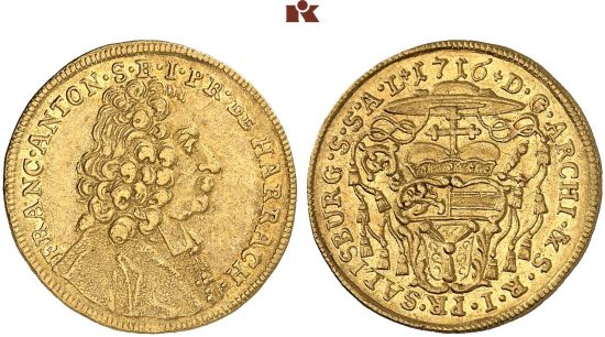 "Franz Anton von Harrach, 1709-1727. Dukat 1716. GOLD. RR Sehr schön-vorzüglich. Erworben im März 1985 von der Partin Bank, Bad Mergentheim. (archbishopric of Salzburg, Francis Anthony of Harrach, 1709-27, ducat of 1716. Very rare, very fine to extremely fine.)"