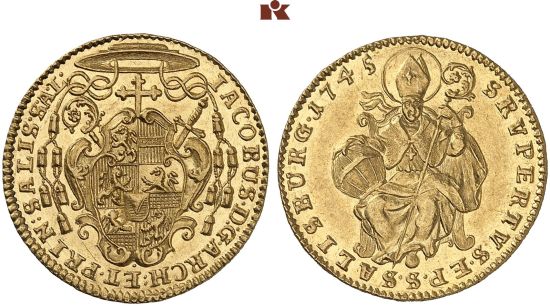 "Jakob Ernst von Liechtenstein, 1745-1747. Dukat 1745. GOLD. R Vorzüglich-Stempelglanz. Exemplar der Auktion Bankhaus Partin 10, München 1980, Nr. 92. (archbishopric of Salzburg, Jacob Ernest of Liechtenstein, 1745-47, ducat of 1745. Rare, extremely fine to uncirculated.)