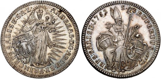 "DIE GEISTLICHKEIT IN DEN HABSBURGISCHEN ERBLANDEN, Andreas Jakob von Dietrichstein, 1747-1753. 1/2 Reichstaler 1752. Die gekrönte Madonna mit Zepter in der Rechten und dem Kind auf dem linken Arm steht v. v. auf Mondsichel, umher Strahlenkranz, l. daneben Familienwappen, darüber Kardinalshut mit herabhängenden Quasten, dahinter Krummstab und Schwert gekreuzt//St. Rupertus mit Mitra, Salzgefäß und Krummstab sitzt nach l. den Kopf nach r. gewandt, r. daneben zweifeldiges Stiftswappen. Sehr selten, besonders in dieser Erhaltung. Kabinettstück. Sehr attraktives Exemplar mit prachtvoller Patina, fast Stempelglanz. Exemplar der Auktion H. D. Rauch 78, Wien 2006, Nr. 703. (associated church principalities of the inherited lands of Austria, Andreas Jakob von Dietrichstein, 1747-1753, half thaler of 1752. Obverse: crowned Virgin with scepter and Child stands on the crescent moon, sunburst around, family arms with cardinal's hat at left; reverse: St. Rupertus with mitre, salt cellar and crozier sits left, head to right, supporting bifold arms. Very scarce, especially in this quality, cabinet piece, very attractive example with exquisite patina, about uncirculated.)"