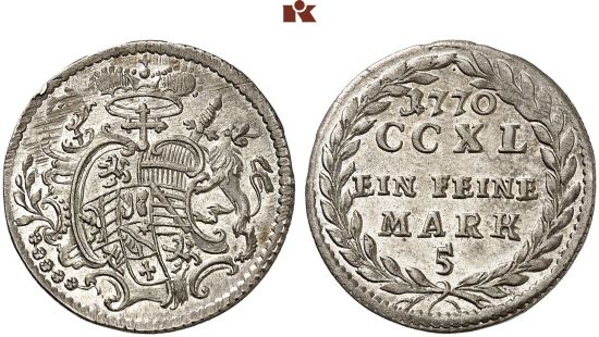 "RÖMISCH-DEUTSCHES REICH. DIE GEISTLICHKEIT IN DEN HABSBURGISCHEN ERBLANDEN, Sigismund III. von Schrattenbach, 1753-1771. 5 Kreuzer 1770. Prachtexemplar. Fast Stempelglanz. (Holy Roman Empire, archbishopric of Salzburg, Sigismund III of Schrattenbach, 1753-71, five kreuzer of 1770. Cabinet piece, About uncirculated.)"