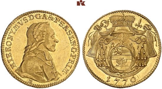 "Hieronymus von Colloredo, 1772-1803. Dukat 1776. Mit Signatur M (Stempelschneider Franz Matzenkopf) unter dem Brustbild. GOLD. Vorzüglich. (archbishopric of Salzburg, Hieronymus von Colloredo, 1772-1803, ducat of 1776, with signature M below the bust. Extremely fine.)"