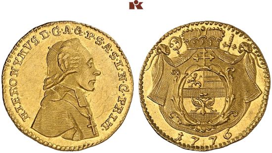 "Hieronymus von Colloredo, 1772-1803. 1/2 Dukat 1776. GOLD. RR Vorzüglich. (archbishopric of Salzburg, Hieronymus von Colloredo, 1772-1803, half ducat of 1776.)"