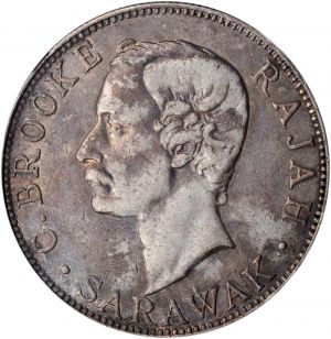 This specimen was lot 45669 in Stack's Bowers ANA sale (Costa Mesa, CA, August 2021), where it sold for $180. The catalog description[1] noted, "SARAWAK. 50 Cents, 1906-H. Heaton Mint. NGC EF Details--Damaged. The obverse is extensively marked and dinged but we consider the "Damaged" designation a little harsh." Sarawak, a British colony on the northwest coast of Borneo, was ruled by a dynasty of white rajahs from 1841 to 1946. This type was issued 1900 and 1906 from Heaton. It is scarce in all grades. It is accompanied by silver five, ten and twenty cents.