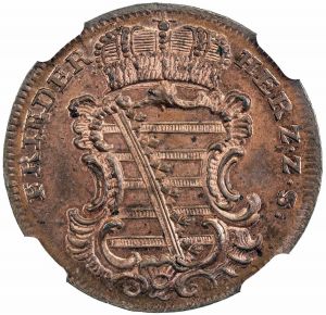 This specimen was lot 1138 in Stephen Album sale 30 (Santa Rosa, CA, January 2018), where it sold for $141. The catalog description[1] noted, "SAXE-GOTHA-ALTENBURG: Friedrich III, 1732-1772, AE 1½ pfennig, 1755-K, much red luster, proof-like strike, just wonderful! NGC graded MS64 RB." Ducats from this postage stamp state are rare and expensive but many of the minors are quite affordable. This type was issued 1752-61.