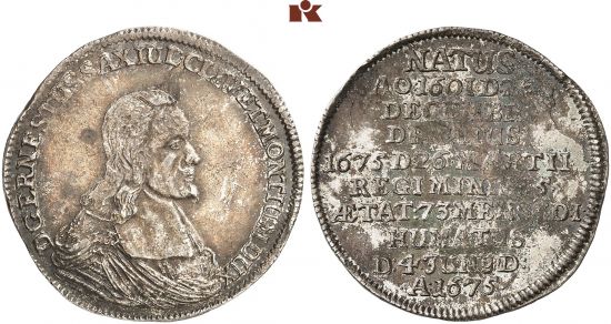 "SACHSEN, SACHSEN-GOTHA, HERZOGTUM, AB 1672 SACHSEN, Ernst der Fromme, 1640-1675. 1/4 Taler 1675, Gotha, auf seinen Tod. Von großer Seltenheit. Prachtvolle Patina, vorzüglich-Stempelglanz. (Germany, duchy of Saxe-Gotha, Ernest, 1640-75, quarter thaler of 1675, on his death. Very rare, mint luster, extremely fine to uncirculated.)"