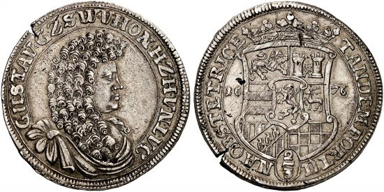 "SAYN, SAYN-WITTGENSTEIN-HOHENSTEIN, GRAFSCHAFT, Gustav, 1657-1701. 2/3 Taler 1676, unbestimmte Münzstätte. Kl. Schrötlingsfehler, sehr schön +. Exemplar der Slg. Bernhard Terletzki. Exemplar der Auktion Fritz Rudolf Künker 20, Osnabrück 1991, Nr. 3234. (Germany, county of Sayn-Wittgenstein-Hohenstein, Gustav, 1657-1701, two-thirds thaler of 1676, unknown mint. Rim crack, very fine or better.)"