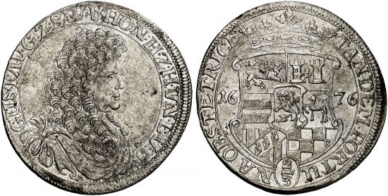 "SAYN, SAYN-WITTGENSTEIN-HOHENSTEIN, GRAFSCHAFT, Gustav, 1657-1701. 2/3 Taler 1676, unbestimmte Münzstätte. Vorzüglich. (Germany, county of Sayn-Wittgenstein-Hohenstein, Gustav, 1657-1701, two-thirds thaler of 1676, unknown mint. Extremely fine.)"