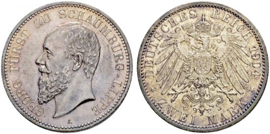 "DEUTSCHLAND | Empire | Schaumburg-Lippe, Fürstentum, Georg, 1893-1911. 2 Mark 1904 A, Berlin. Gutes vorzüglich. Feine Patina. (Germany, principality of Schaumburg-Lippe, George, 1893-1911, two mark of 1904, Berlin mint. Good extremely fine, Nice toning.)"