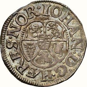 This specimen was lot 11539 in Stack's Bowers Collectors Choice Online Auction (Costa Mesa, CA, February 2025), where it sold for €504 (about US$525). The catalog description[1] noted, "GERMANY. 1/16 Taler, 1619. Schleswig-Holstein-Sonderburg. Hans (Johan) den yngre. NGC MS-62. Nicely detailed coin with rich colorful toning. From the L. E. Bruun Collection." Wikipedia comments, "Schleswig-Holstein-Sonderburg was the name of a branch line of the House of Oldenburg as well as the name of their land. It existed from 1564 until 1668 and was a titular duchy under the King of Denmark, rather than a true territorial dukedom in its own right." John the Younger (b. 1545, r. 1594-1622) was the first of four dukes of this line. The duke issued other double schillings in 1619 (KM 5, KM 9) using different dies.