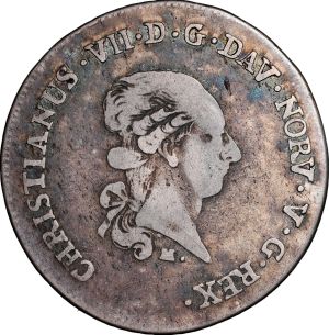 The division of the late eighteenth century products of the Altona mint into issues of Denmark and issues of Schleswig-Holstein is arbitrary. Here, we will file coins under Denmark unless Schleswig-Holstein is specifically mentioned. This one, with the reverse legend "20 SCHILLING· SCHLESW·HOLST· COURANT·", is clearly an example of the latter. This specimen was lot 10374 in Stack's Bowers Collectors Choice Online Auction (Costa Mesa, CA, February 2025), where it sold for €192 (about US$200). The catalog description[1] noted, "DENMARK. Schleswig-Holstein. 1/3 Speciedaler, 1789-MF. Altona Mint. Christian VII. NGC F-12. Spelling error 'DAV' instead on 'DAN'. From the L. E. Bruun Collection." In Denmark, 96 skilling = one speciedaler but in late eighteenth century Germany, 120 kreuzer = one convention thaler. This coin was likely intended to pass for half a gulden. It was struck 1789 only and is scarce. The initials MF stood for Michael Flor, mintmaster at Altona 1787-1818. Christian VII was insane for most of his reign and the government was in the hands of regents, including his stepmother and later his son. The court was the scene of violent power struggles over who would have access to the incapable king. Schleswig was Danish-speaking while Holstein was German; the conflicts arising therefrom led to the whole region being conquered and annexed by Prussia in the 1860's.
