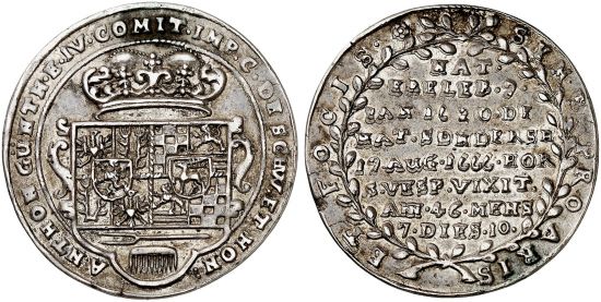 "SCHWARZBURG, SCHWARZBURG-SONDERSHAUSEN, GRAFSCHAFT, Anton Günther I. 1642-1666. 1/4 Reichstaler 1666, Sondershausen, auf seinen Tod am 19. August. Von großer Seltenheit. Attraktives Exemplar mit hübscher Patina, sehr schön-vorzüglich. (Germany, county of Schwarzburg-Sondershausen, Anthony Gunther I, 1642-66, quarter thaler of 1666, Sondershausen mint, on his death. Very rare, atractive example with handsome patina, very fine to extremely fine.)"