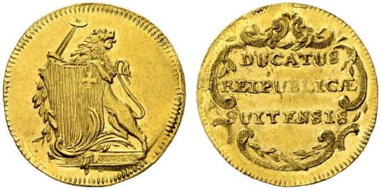 "Dukat o. J. (1779). Selten. Vorzüglich. (canton of Schwyz, undated ducat (1779), rare, extremely fine.)"