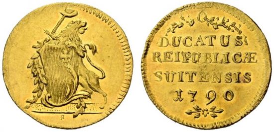 "Dukat 1790. Selten. Fast vorzüglich. (canton of Schwyz, ducat of 1790, choice extremely fine.)"