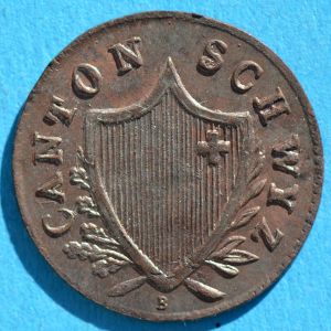 This type is listed for 1811-15 and 1842-46 from the canton of Schwyz. After being temporarily unified under Napoleon's Helvetic Republic, the cantons went their separate ways after the Congress of Vienna and issued a torrent of low value coins. Not until 1850 would a unified confederation mint her own coins and terminate the local issues.