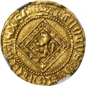 This specimen was lot 21356 in Stack's Bowers 2018 NYINC sale (New York, January 2018), where it sold for $4,800. The catalog description[1] noted, "SCOTLAND. Demy, ND. James I (1406-37). NGC AU-55. Mintmark crown/cross, lion rampant on lozenge; reverse: saltire and lis within ornate tressure, large quatrefoils in angles, lis stops on both sides. Well struck with partial rims. A RARE and popular type. Light toning and fully original." This and a half demy (Fr-9) are the only gold coins listed for this ruler.