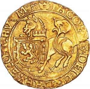 "Historic James V Unicorn, Ex Murdoch Collection (1903). SCOTLAND. Unicorn, ND (1513-42). Edinburgh Mint; mm: x/crown. James V. NGC VF-30. S-5365; Fr-22; Burns-5 (fig. 733). Weight: 3.85 gms. First Coinage, Without Countermark. A beautiful piece with rich honey-gold tone and hints of powder-blue iridescence. The surfaces are smooth and glossy without any notable blemishes throughout. Off center towards 12 o'clock on both sides but otherwise well defined. The unicorn and shield on the obverse are dramatically echoed from a multitude of strikes. Perhaps one of the most historic examples available, this coin has been mistakenly identified as S-5364 (with countermark) on the NGC label. The gold unicorn was issued for roughly the first decade of James V's technical rule before being replaced by the crowns of the second coinage circa 1526. While his official coronation was in 1512 at the age of one, James V did not fully embrace the kingship until 1528, after dismissing his regents and escaping from the custody of Archibald Douglas, the 6th Earl of Angus. From the Loch Ness Collection. Ex: St. James's Auctions (6/2007) Lot # 464. Ex: WAG (6/2005) Lot # 5060. Ex: Leu (10/2004) Lot # 512. Ex: John G. Murdoch Collection (Sotheby, Wilkinson & Hodge - 5/1903) Lot # 166."