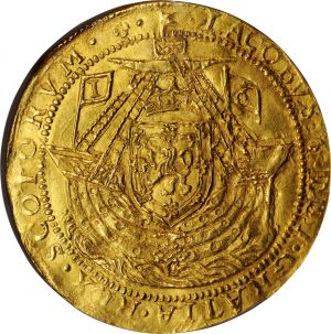 The thistle nobles of James VI, officially regarded as the "Scottis Roisnobillis," were authorized by Act of Privy Council on September 13th, 1588. They were intended to be a direct counterpart to the English Rose Noble in "wecht and fnness". Survivors are SCARCE overall and most examples show considerable wear or impairments. This piece is distinctly superior to most, with astounding Mint State preservation and a pedigree to the famed LaRiviere Collection. It is also plated in the Spink reference, further emphasizing the exemplary quality. From the Loch Ness Collection. Ex: Lucien LaRiviere Collection (Spink - 4/2006) Lot # 150. Ex: Sotheby's (10/1990) Lot # 388.Ex: Spink (2/1979) Lot # 1103."