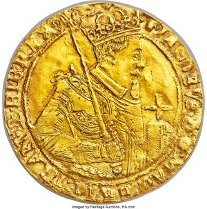 This specimen was lot 31646 in Heritage sale 3064 (Chicago, April 2018), where it sold for $2,160. The catalog description[1] noted, "James VI gold Unite ND (1609-25) AU Details (Repaired) NGC, Tenth coinage. An attractive and presentable example of this large gold issue, James's portrait especially clear and bold for the typically soft strike. The legends are slightly double-struck but generally prominent, the designs sharp, the overall appearance a strong representative of the Scottish Unite series with little evidence of repair marring the surface. From the Collection of A Scottish Gentleman." The coinage of Scotland prior to unification with England is confusing. Bullion was scarce, so issues were small and sporadic. Pence and shillings were used but were not worth their English equivalents.