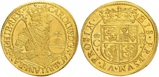 "Charles I. 1625-1649 Unite o. J. (1637-1642). Edinburgh. Sehr selten. Vorzüglich. Kl. Feld der Vorderseite minimal bearbeitet. (kingdom of Scotland, Charles I, 1625-49, undated unite, Edinburgh mint. Very rare, Extremely fine, Small area on obverse slightly smoothed.)"