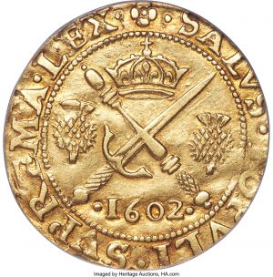 This specimen was lot 32198 in Heritage sale 3076 (Long Beach, CA, September 2019), where it sold for $2,520. The catalog description[1] noted, "Scotland: James VI (I) gold Sword & Scepter 1602 XF45 PCGS, Edinburgh mint. Obv. Crowned coat-of-arms. Rev. Sword and scepter crossed in saltire; crown above, thistle to left and right, date below. Minor areas of weakness in the legends, with most of the design and legend well struck with some remaining luster. A very popular type." The coinage of Scotland prior to unification with England is confusing. Bullion was scarce, so issues were small and sporadic. Pence and shillings were used but were not worth their English equivalents. This "sword and sceptre" was worth about one English pound.