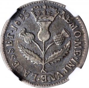 This specimen was lot 46036 in Stack's Bowers ANA sale (Costa Mesa, CA, August 2021), where it sold for $90. The catalog description[1] noted, "SCOTLAND. 5 Shillings, 1695. Edinburgh Mint. William II. NGC F-12. Well centered with faint steel-blue and golden iridescence. Old scratches and marks noted under scrutiny, but nicely glossed to the naked eye. From the Loch Ness Collection." This type, struck 1695-1700, is roughly equal to a British sixpence. The Act of Union in 1707 ended the Scottish coinage. This example seems quite underweight.