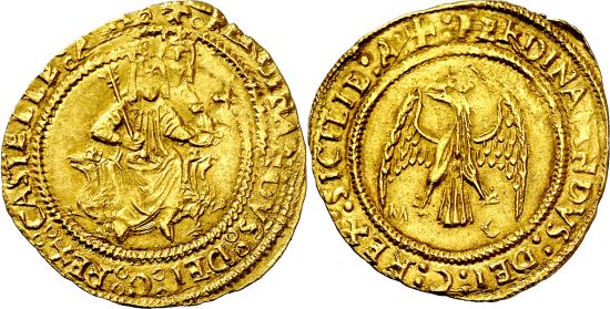 The second specimen was lot 1325 in Aureo y Calicó sale 423 (Barcelona, December 2023), where it did not sell. The catalog description[2] noted, "Ferran II (1479-1516). Sicily. Eagle or trionfo. Slight[ly] double-struck. MBC+ [choice very fine]." Altho Ferdinand was king of Aragon from 1479, his claim to the kingdom of Sicily was not made good until 1504, when the army of Louis XII of France was routed. Other gold coins for Sicily during this reign include Fr-657a (double tripolina), Fr-658 (double ducat), Fr-660 (half ducat) and Fr-660a (double trionfo). Sicily remained under Spanish rule until the death of Charles II in 1700.