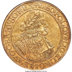 "Seemingly Unpublished Breslau 10 Ducat of 1670. Austria - Leopold I gold 10 Ducat 1670-SHS XF Details (Removed From Jewelry) NGC, Breslau mint, Salomon Hammerschmidt as wardein. A type within the Austrian-Silesian series that remains essentially unsurpassed in status. This 10 Ducat issue is, by all indications, the largest gold denomination minted under Salomon Hammerschmidt's tenure as wardein of Breslau mint, the next highest being an unpublished 3 Ducat. Entirely unrecorded in standard literature, the only reference to 10 Ducat pieces produced under Leopold in Breslau comes from Friedberg, who cites the dates 1663, 1674, and 1695, none of which appear in the Corpus Nummorum Austriacorum. Our research has revealed that an example from 1663 is the only date to reach the marketplace in recent years--though Friedberg mentions an example (date unspecified) coming to light in the 2008 New York Sale. This carried the initials of wardein Georg Hübner and was of a very distinctive style compared to the coin presented here. Additionally, these dies do not seem to match any known taler issues. According to records of the Deutsches Münzpreis-Jahrbuch, no 10 Ducats of this date have appeared in auction since at least the late 90s. Despite some mild damage from its use in jewelry and clear circulation wear, the devices appear of a carefully measured style, with Leopold's bust taking on a much more humanistic appearance than that of the more heavily caricatured style seen on contemporary emissions. Almost certainly unique, we can think of few entries in the series that should command as much attention. From the Paramount Collection."
