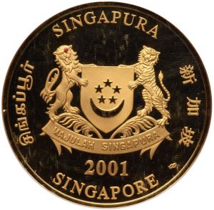 This specimen was lot 1356 in Goldberg Sale 139 (Los Angeles, June 2024), where it sold for $2,280. The catalog description[1] noted, "Singapore. 250 Dollars, 2001. Lunar series. Year of the Snake. Arms with supporters. Reverse: Stylized snake. Pop 11; 10 graded PF70 UCam. NGC graded Proof 69 Ultra Cameo. Ex Goldberg Sale 44, Feb 10, 2008, lot 4179. The Peh Collection Part II." The colony of Hong Kong was the first to produce and market NCLT's themed to the Chinese zodiac. These proving popular, other countries followed suit, including Singapore, which issued this for the Year of the Snake.