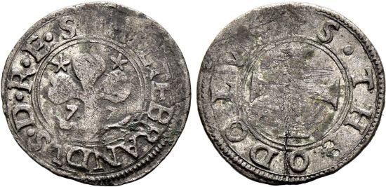 "SCHWEIZ Wallis/Valais, Sitten, Bistum, Hildebrand I. von Riedmatten, 1565-1604. Kreuzer 1577, Sitten. Familienwappen ohne Schild in doppeltem Innenkreis. Die mindere Jahreszahl (15)77 wird durch den Kleeblattstengel geteilt. Rv. Kreuz, ebenfalls in doppeltem Innenkreis. Sehr selten. Fast sehr schön. Knickspur mit Schrötlingsriss. Exemplar der Slg. Zuberbühler, Auktion 16, Zürich, Oktober 2013, aus Los 6197. (Switzerland, canton of Valais, Hildebrand I. von Riedmatten, 1565-1604, kreuzer of 1577, Sitten mint. Obverse: family arms without shield in double circle with two digit date; reverse: cross in double circle. Very rare, About Very Fine, Bent and flan crack.)"