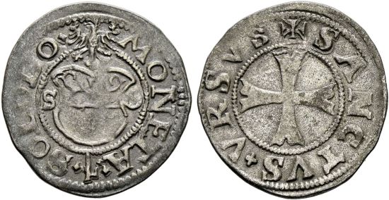 "SCHWEIZ Solothurn, Kreuzer o. J. (1565-1568), Solothurn. Vorderseite mit neuem Münzzeichen Zainhaken. Selten. Gutes sehr schön. Das Münzzeichen Zainhaken wird Onofrion Wohnlich zugeschrieben und kommt in den Jahren 1565 bis 1568 vor. Damit ist die Prägezeit dieses Stücks definiert. (Switzerland, canton of Solothurn, undated kreuzer, circa 1565-68, Solothurn mint. Obverse with crossed hooks mintmark. Rare, Good very fine. The cross hooks mint mark is attributed to Onofrion Wohnlich and appears in the years 1565 to 1568. This defines the minting period of this piece.)"