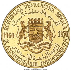 This specimen was part of lot 31203 in Heritage sale 3081 (New York, January 2020), which sold for $7,200. The catalog description[1] noted, "Somalia: Republic 5-Piece Uncertified gold "10th Anniversary of Republic" Proof Set 1970, 1) 20 Shillings; 2) 50 Shillings; 3) 100 Shillings, KM 19; 4) 200 Shillings, KM 21; 5) 500 Shillings. Appealing, each unhandled and with light copper-gold tone. Accompanied by case of issue. Total AGW 3.5243 oz." This type was issued in sets with gold 20, 100, 200 and 500 shillings, most likely distributed to the president's friends and cronies.