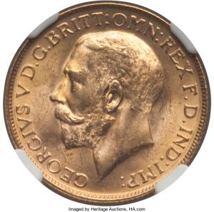 This specimen was lot 33797 in Heritage sale 3064 (Chicago, April 2018), where it sold for $600. The catalog description[1] noted, "George V gold Sovereign 1928-SA MS65+ NGC, Pretoria mint. Satiny golden luster crisps the devices and endows this gold beauty with an attraction seldom encountered in this sovereign series.." The Pretoria mint operated as a branch of the Royal mint, striking George V sovereigns 1923-32.
