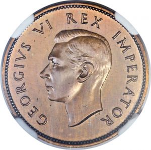 This specimen was part of lot 30610 in Heritage sale 3040 (Chicago, April 2015), which sold for $1,938.75. The catalog description[1] noted, "George VI 8 Coin Certified Proof Set 1944, KM-PS16. Mintage: 150 sets. All coins certified by NGC as follows: Farthing, PR65 Brown, 1/2 Penny, PR64 Brown, Penny, PR65 Brown, 3 Pence, PR64, 6 Pence, PR66, Shilling, PR63, 2 Shillings, PR65, 2.5 Shillings, PR64. A most attractive Proof set, featuring three bronze coins that display glossy, chestnut-brown color and impeccably struck design elements. The remaining silver denominations all present frosty, mirrored fields with a dramatic amount of iridescent rainbow tone throughout. A superb, matching set, with incredible eye appeal. Scarce in these select designations and highly-collectible as such." The farthing was struck in South Africa 1923-60. This date is common.