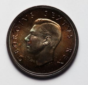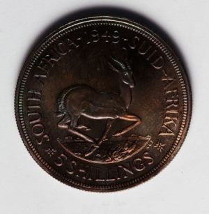 This specimen was part of lot 29123 in Heritage sale 3022 (New York, January 2013), which sold for $1,175. The catalog description[1] noted, "George VI Proof Set 1949, the nine coin set in the original mint case. Always popular as the Shilling is a Proof only date with a mintage of 800." The crown or five shillings was struck in South Africa 1947-60. It was 0.800 fine silver until 1950 and 0.500 fine thereafter. The crown is more common than the shilling, florin or half crown for 1949.