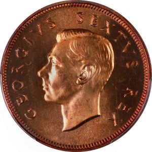 This specimen was lot 75660 in Stack's Bowers Collectors Choice sale (Costa Mesa, CA, November 2022), where it sold for $60. The catalog description[1] noted, "SOUTH AFRICA. Penny, 1951. Pretoria Mint. George VI. PCGS PROOF-66 Red. Fully red with sparkling original luster and a near perfect strike." This type was struck 1951-52 only but is common.