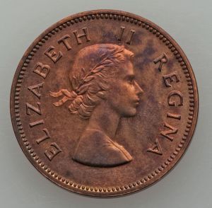The first specimen was part of lot 25779 in Heritage sale 3026 (Long Beach, October 2013), which sold for $199.75. The catalog description[1] noted, "South African assortment: a nice selection of mostly choice 20th-century coins, uncertified and perfect for the collector who likes to make his own grading decisions." The second specimen was part of lot 36654 in Heritage sale 3038 (Dallas, January 2015), which sold for $540.50. The catalog description[2] noted, "Republic Eleven-Coin Proof Set 1953, KM-PS26. Mintage 600 sets. Farthing to 1/2 and Pond gold. A beautifully-toned set with all coins choice proof and exhibiting mottled surfaces with iridescent patina. Sold with box of issue." In 1960, South Africa withdrew from the British Commonwealth and in 1961 issued all new coins, dropping the bust of the queen for explorer Jan van Riebeeck. This type was issued 1953-60 along with a bronze penny (KM 46) and farthing (KM 44). It is common.