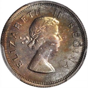 This specimen was lot 23588 in Stack's Bowers ANA sale (Philadelphia, August 2018), where it sold for $840. The catalog description[1] noted, "SOUTH AFRICA. Eleven Piece Proof Set, 1958. Comprises Farthing (PCGS PR66BN), Half Penny (PCGS PR64RB), Penny (PCGS PR66+BN), Threepence (PCGS PR67), Sixpence (PCGS PR66), Shilling (PCGS PR66), 2 Shillings (PCGS PR65), 2½ Shillings (PCGS PR66), 5 Shillings (PCGS PR66), Half Pound (PCGS PR65) and Pound (PCGS PR66). All are toned." In 1960, South Africa withdrew from the British Commonwealth and in 1961 issued all new coins, dropping the bust of the queen for explorer Jan van Riebeeck. This type was issued 1953-60 along with a silver threepence, shilling, florin, half crown and crown. It is common.