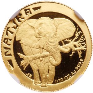 This specimen was lot 1569 in Goldberg sale 128 (Los Angeles, June 2022), where it sold for $240. The catalog description[1] noted, "South Africa. 1/10 Natura, 1996. Only 9,014 minted of this one year type. Elephant on both sides. NGC graded Proof 69 Ultra Cameo."1996. Only 3,740 minted of this one year type. Elephant. NGC graded Proof 70 Ultra Cameo." South Africa, after a turbulent history between English and Dutch settlers and the native population, was constituted the Union of South Africa in 1910. Coinage commenced in 1923. The krugerrand was introduced in 1967 as a one ounce gold bullion coin and was very popular around the world despite bearing the effigy of Paul Kruger, the chief exponent of apartheid. The white supremacist regime was ousted in 1989 but, amazingly enough, the krugerrand remains in production. As competition for it, the South African government also marketed the Natura series, featuring various animals native to the region. The elephant is depicted on this issue of 1996.