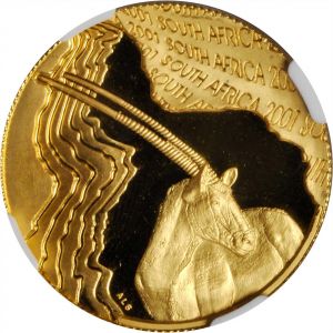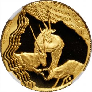This specimen was lot 7288 in Stack's Bowers NYINC sale (New York, January 2017), where it sold for $646.25. The catalog description[1] noted, "SOUTH AFRICA. 1/2 Natura, 2001. NGC PROOF-69 ULTRA CAMEO. Features the Oryx or Gemsbok. Hard mirror fields with highly frosted devices. Superb eye appeal." South Africa, after a turbulent history between English and Dutch settlers and the native population, was constituted the Union of South Africa in 1910. Coinage commenced in 1923. The krugerrand was introduced in 1967 as a one ounce gold bullion coin and was very popular around the world despite bearing the effigy of Paul Kruger, the chief exponent of apartheid. The white supremacist regime was ousted in 1989 but, amazingly enough, the krugerrand remains in production, tho in much reduced numbers. As competition for it, the South African government also marketed the Natura series, featuring various animals native to the region.