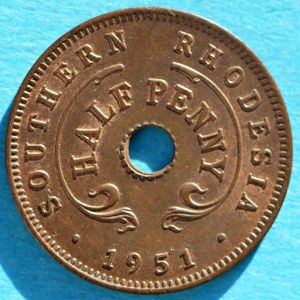 Rhodesia, named after diamond magnate Cecil Rhodes, was created a self-governing colony of Britain in 1923. Coinage commenced in 1932. The penny was introduced in 1934 and struck intermittently until 1954. This type is known for 1951-52 and is common. The hole served two purposes: one, to prevent confusion with a higher denomination coin; two, to prevent natives from drilling their own holes when stringing them on necklaces.