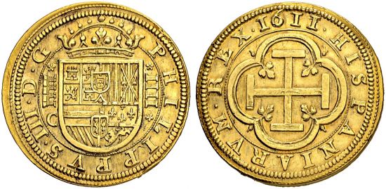 "SPAIN | Königreich, Felipe III. 1598-1621. 4 Escudos 1611, Segovia. Sehr selten. Gutes vorzüglich. Kleiner Randfehler. (kingdom of Spain, Philip III, 1598-1621, four escudos of 1611, Segovia mint. Very rare, Good extremely fine, Minor edge flaw.)"