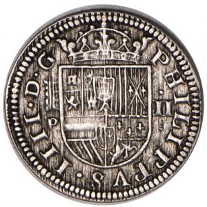 This two reales was issued by the Segovia mint in Spain during the reign of Philip IV. This well struck, nicely centered coin may be contrasted with the crude cobs being minted at the Latin American mints, where screw presses were not installed until the 18th century. The type was struck at Segovia 1627-29 and 1652-59 as well as at Toledo. Two reales cobs were minted at Seville and Madrid during this period. This specimen was lot 866 in Stack's Coin Galleries sale (New York, October 2010), where it sold for $115. The catalog description noted, "SPAIN. Felipe IV, 1621-1665. 2 Reales, 1627 P. Segovia. Crowned shield. Rv. Castles and lions in lobate frame. Striae on both sides are apparently the result of roller die production. Choice Extremely Fine."