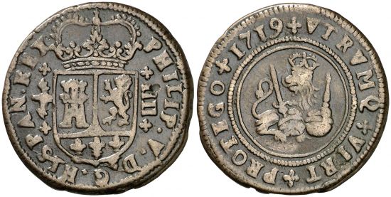 "1719. Felipe V. València. 4 maravedís. MBC. (Spain, Philip V, four maravedis of 1719, Valencia mint, very fine.)"