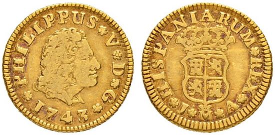 "Felipe V. 1700-1746 1/2 Escudo 1743. JA-Madrid. Sehr schön. (kingdom of Spain, Philip V, 1700-46, half escudo of 1743, Madrid mint. Very fine.)"
