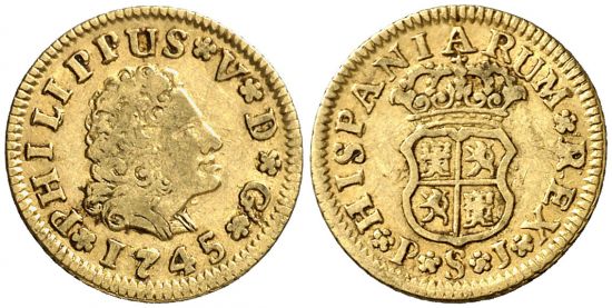 "1745. Felipe V. Sevilla. PJ. 1/2 escudo. MBC-/MBC. (Spain, Philip V, half escudo of 1745, Seville mint, very fine.)"