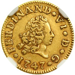 This specimen was lot 5235 in Goldberg sale 72 (Los Angeles, February 2013), where it sold for $190. The catalog description[2] noted, "Spain. ½ Escudo, 1747-JB (Madrid). Ferdinand VI. Head right. Reverse: Crowned arms. NGC graded EF-45." This type was struck in Madrid and Seville 1746-59 and is not especially rare. Half escudos were struck in metropolitan Spain 1738-97 in considerable numbers and are quite a bit more common than their silver equals, the eight reales. This is opposite from Latin America, where silver pesos were minted in vast quantities but half escudos would not be minted until the reign of Ferdinand VII.